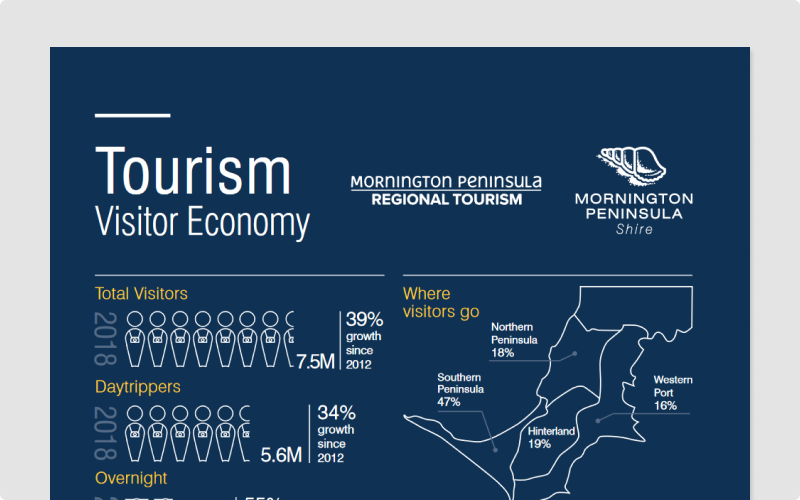 The information presented provides a snapshot of the Mornington Peninsula Visitor Economy. It highlights key results from the 2019 Mornington Peninsula Visitor Journeys Report. Data available includes; number of visitors, visitor contribution to expenditure, impact on tourism jobs as well as visitor behaviour.