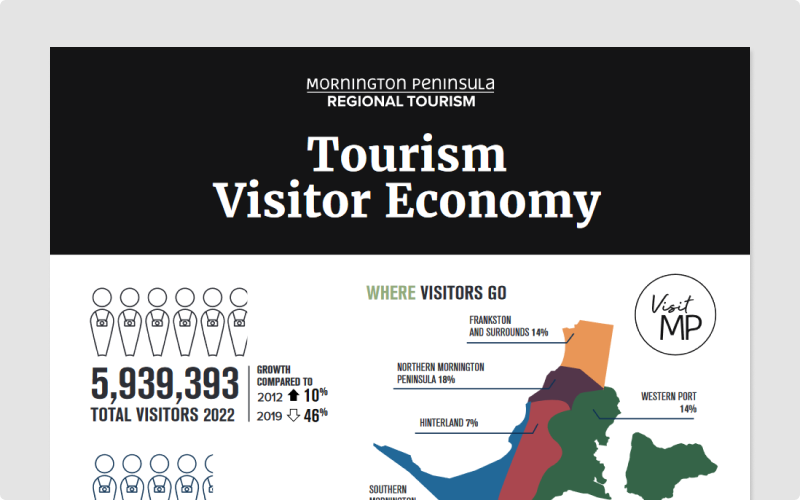 The information presented provides a snapshot of the Mornington Peninsula Visitor Economy. It highlights key results from the 2022 Mornington Peninsula Visitor Journeys Report. Data available includes; number of visitors, visitor contribution to expenditure, impact on tourism jobs as well as visitor behaviour.